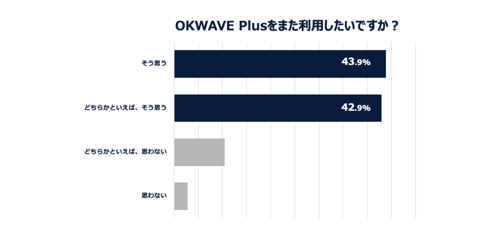 この結果から、知っている情報を自分自身の言葉で発信する事で自身の知識定着に繋げるといった自己啓発に加え、誰かのために役立ちたい、お礼がうれしいといった内発的動機からコミュニティに参加いただいているのがOKWAVE Plusの大きな特徴のひとつとも言えることが分かりました。