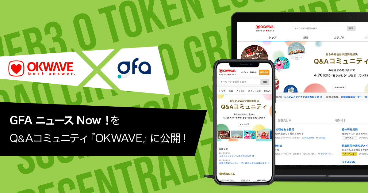 「GFAニュースNow!」は、GFAおよびグループ各社が展開するWeb3.0領域の活動や商品・サービス情報、寄稿記事などを集約し、Q&Aコミュニティ『OKWAVE』内にて発信する特設エリアです。
