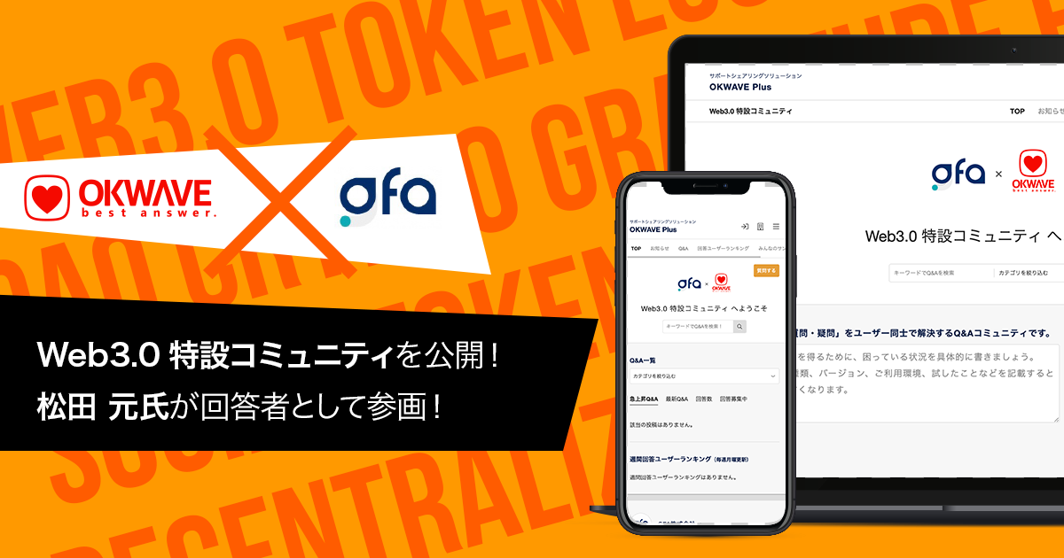「世界中のありがとうの物語を蓄積し可視化する」をパーパスとし、法人・個人向けコミュニティサービスを展開する株式会社オウケイウェイヴ(東京都港区、代表取締役:杉浦 元、以下「オウケイウェイヴ」)は、GFA株式会社(東京都港区、代表取締役:松田 元、以下「GFA」)とのWebプロモーション施策の第3弾として、オウケイウェイヴが提供する『OKWAVE Plus』に、「Web3.0特設コミュニティ」を開設し、松田 元氏が専門家回答者として参画します。