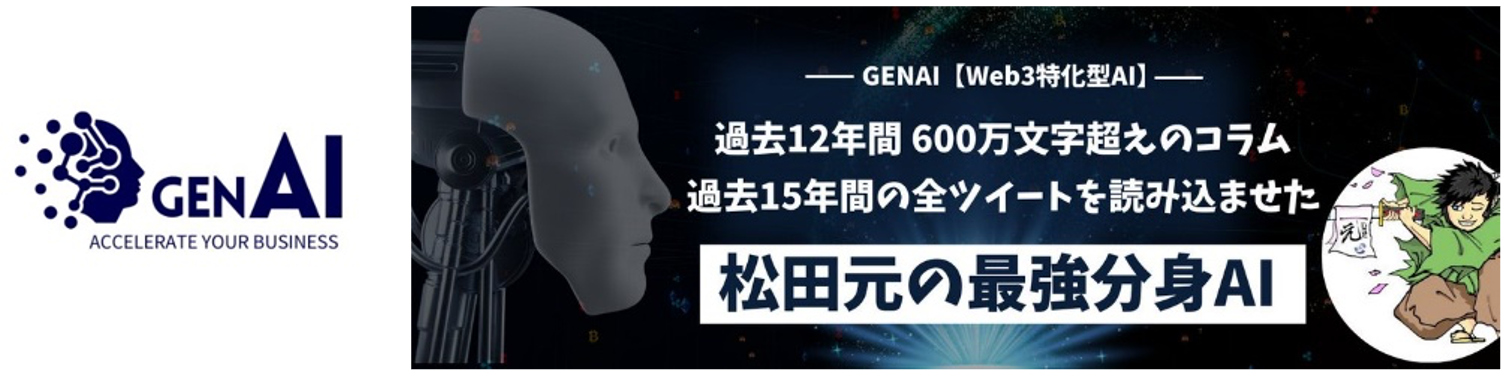 「GENAI」は、松田氏の過去12年間で発信した600万字超のコラムと15年間の全ツイートを学習し、膨大な知識を詰め込んだ松田元の分身として誕生したWeb3特化型の松田氏の分身AIです。