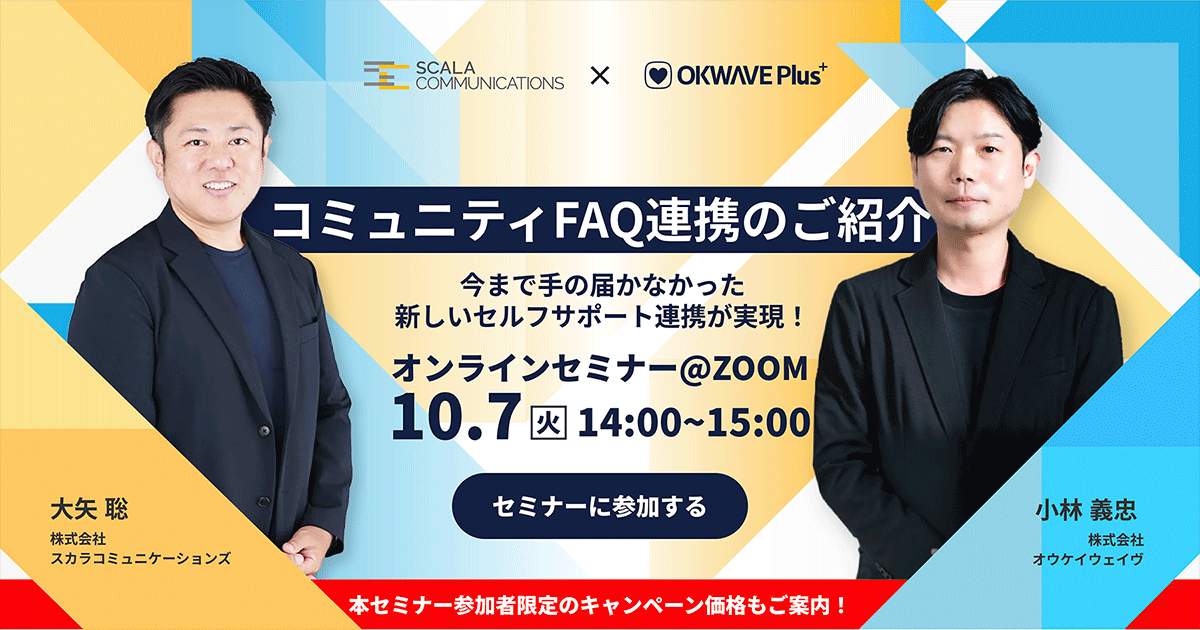 「世界中のありがとうの物語を蓄積し可視化する」をパーパスとし、法人・個人向けコミュニティサービスを展開する株式会社オウケイウェイヴ(本社所在地:東京都港区、代表取締役:杉浦 元、以下「オウケイウェイヴ」)は、「FAQサイトとコミュニティFAQの融合による次世代セルフサポートの実現」をテーマに、株式会社スカラコミュニケーションズ(本社:東京都渋谷区、代表取締役:新田英明)を共催企業として迎えた無料オンラインセミナーを開催いたします。