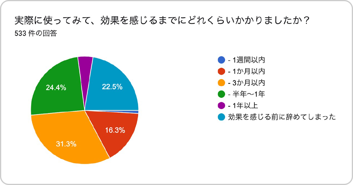 一方、実際に効果を実感するまでに6ヶ月以上かかった人と効果を感じる前に辞めてしまった人の合計は(51.4%)となりました。