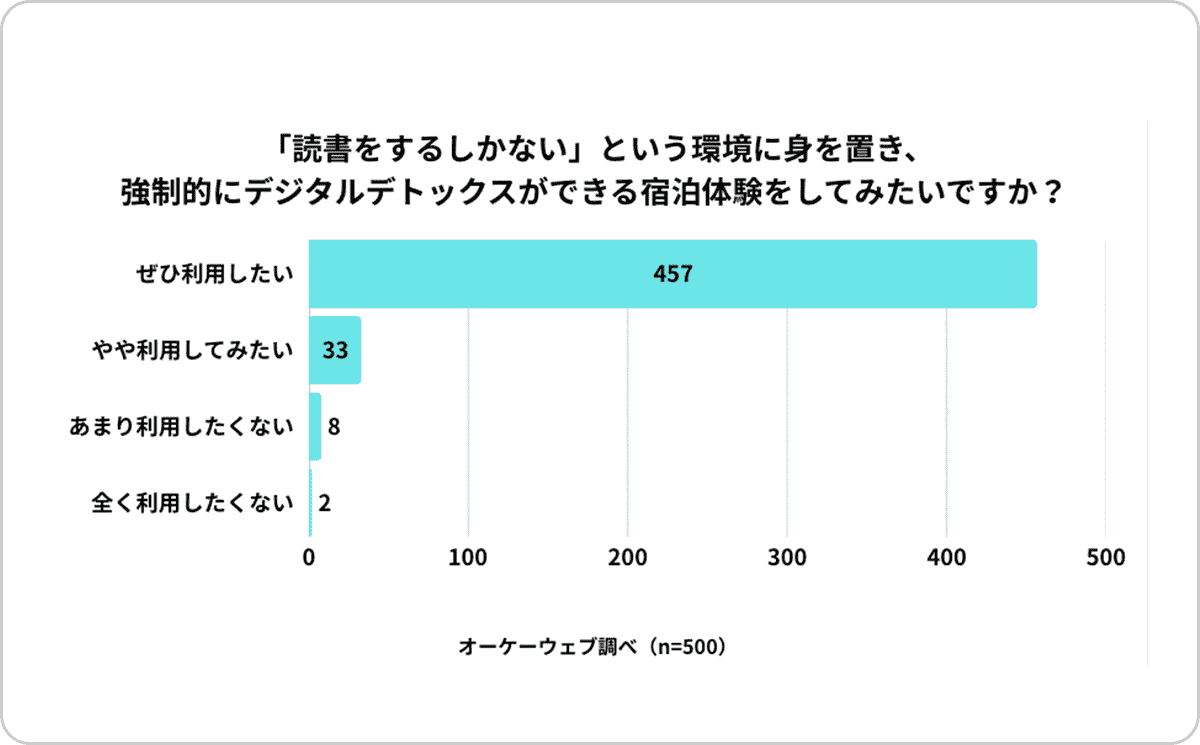 自宅でのデジタル断ちの難しさを踏まえ、「大量の本に囲まれて読書をするしかない環境(施設)」への利用意向を尋ねたところ、91.3%が「ぜひ利用してみたい」と回答しました。