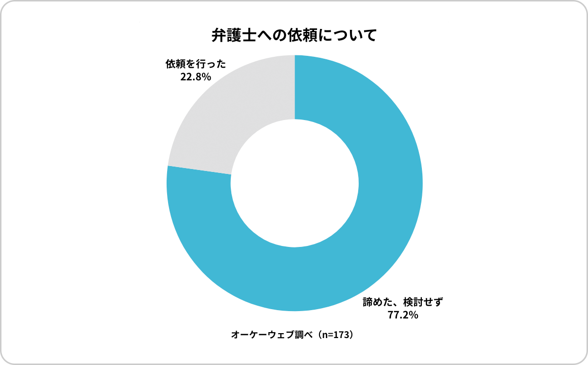しかし、そのうちの77.2%(173名)が「弁護士への依頼を途中で諦めた、あるいは最初から検討しなかった」と回答しています。