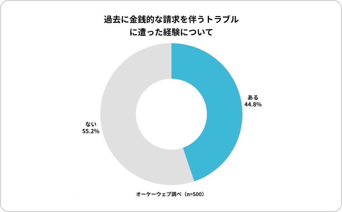 全国500名のうち、過去に金銭的な請求を伴うトラブルに遭った経験が「ある」と回答したのは224名(44.8%)でした。