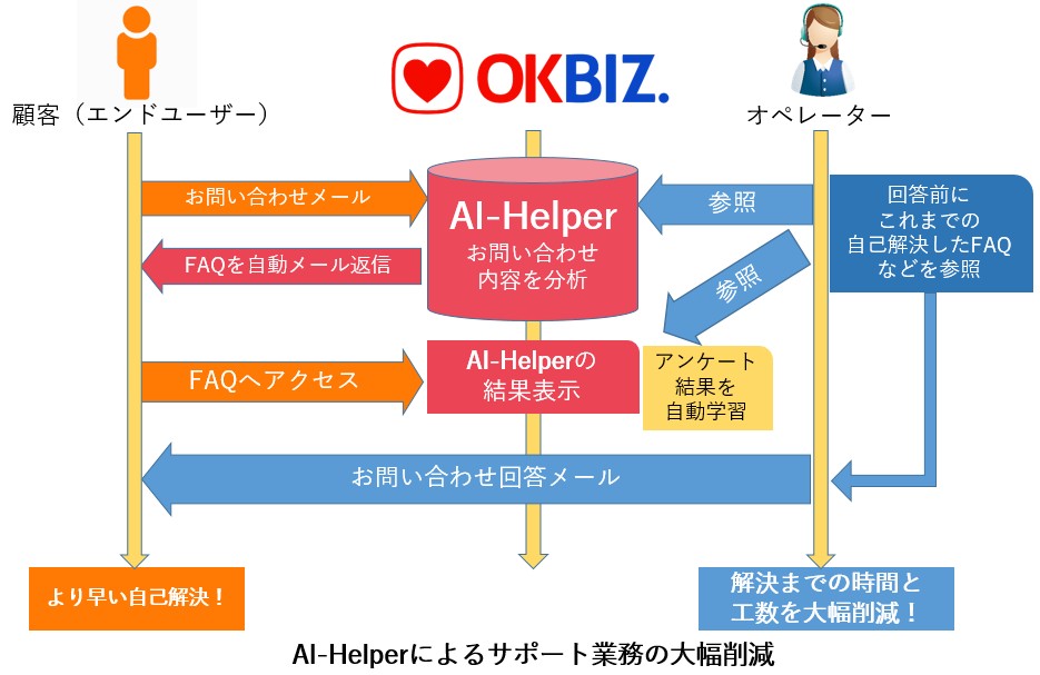 このたび発売を開始した最新版『OKBIZ. for FAQ / Helpdesk Support Ver.7.14』(以下、『OKBIZ. Ver.7.14』)は、「AI」と「つながり」を特徴とする新機能を搭載し、顧客サポート業務の大幅削減に貢献します。