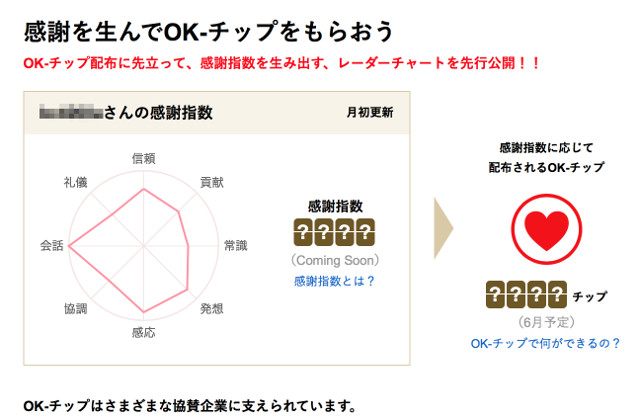 『感謝指数レーダーチャート』は、ユーザー自身がQ&Aを通じたより良いやりとりを考えて行動する目安となるとともに、ユーザーの他者への貢献や感謝の気持ちを大きく後押し、日々の感謝を楽しむものとして、今後公開予定の「OK-チップ」などとも連携しながら「感謝の循環」を作り出すものとなります。