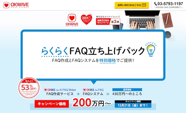日本初、最大級のQ&Aサイト「OKWAVE」を運営する株式会社オウケイウェイヴ(本社:東京都渋谷区、代表取締役社長:松田 元)は、AIがFAQの作成を自動で支援するソリューション「OKBIZ. for AI FAQ Maker」と、FAQ運用を一元管理できるFAQシステム「OKBIZ. for FAQ」をセットにして、特別価格にて提供するオウケイウェイヴ20周年記念キャンペーン第2弾『らくらくFAQ立ち上げパック』の提供を2018年11月15日(木)〜12月21日(金)の期間限定にて実施します。