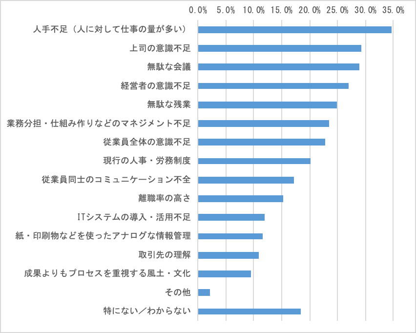 また、「改革を妨げていると思う要素」では、「人手不足」(34.7%)、「上司の意識不足」(29.3%)、「無駄な会議」(28.9%)が上位トップ3となりました。