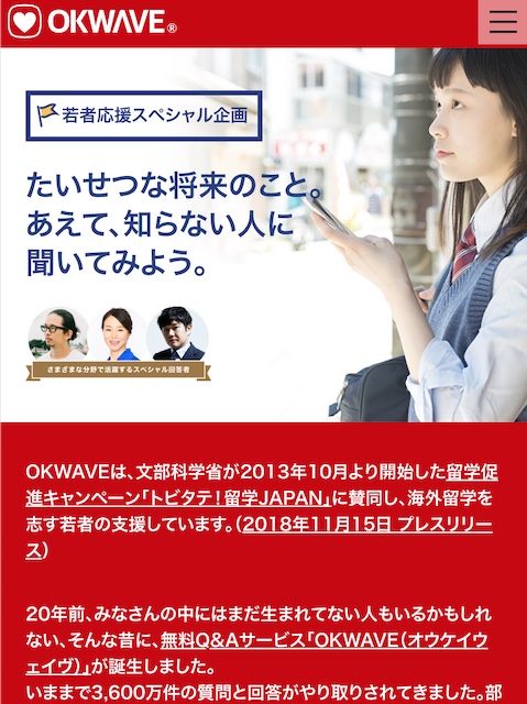 日本初、最大級のQ&Aサイト「OKWAVE」を運営する株式会社オウケイウェイヴ(本社:東京都渋谷区、代表取締役社長:松田 元)は、文部科学省初の官民協働プロジェクトである、高校生や大学生の海外留学を支援する制度「トビタテ!留学JAPAN日本代表プログラム」への若者応援スペシャル企画『たいせつな将来のこと。あえて、知らない人に聞いてみよう。』を2019年2月5日(火)〜19日(火)の15日間限定で開催します。