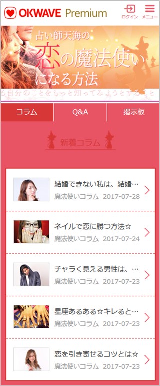日本初、最大級のQ&Aサイト「OKWAVE」を運営する株式会社オウケイウェイヴ(本社:東京都渋谷区、代表取締役社長:兼元 謙任)は、各分野の著名人がQ&Aを通じて自分磨きのサポートをしてくれる会員制有料Q&Aプラットフォーム「OKWAVE Premium」にて、株式会社森と紙ひこうき(本社:静岡県熱海市、代表取締役社長:麻羽たんぽぽ)の協力により新サービス『占い師天海(あみ)の恋の魔法使いになる方法』の提供を2017年8月16日より開始しました。