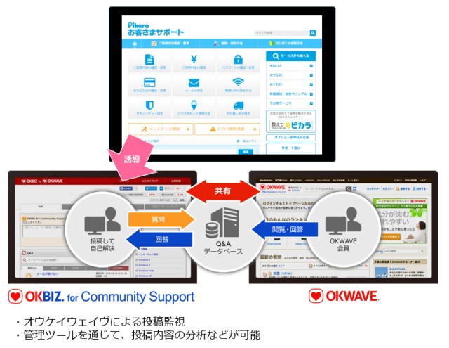 「OKBIZ. for Community Support」は利用者同士で問題解決できるCtoC型のサポートコミュニティーです。日本初、最大級のQ&Aサイト「OKWAVE」との連携により、利用者が「OKWAVE」ユーザーからも回答が得られることや投稿監視等の運用部分を当社が行うことにより企業側の負担が少なく導入できます。国内大手企業をはじめ、主にパソコンやデジタル製品などトラブルの原因箇所がわかりづらく、サポート対応が難しい製品を取り扱われている企業に導入されています。