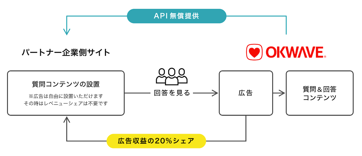 このたび開始した『OKWAVE Q&Aコンテンツパートナープログラム』は、「OKWAVE」の各機能を「OKWAVE Q&A API」としてAPI化し企業向けにデータ提供する新たなパートナービジネスの第1弾です。本プログラムに参画したパートナー企業はAPIを活用することで「OKWAVE」ユーザーから投稿され日々拡大を続けている800万件以上のあらゆる分野の質問コンテンツを自社サイトに設置できます。設置した質問コンテンツの“回答”が掲載された「OKWAVE」のQ&A(質問&回答)コンテンツにユーザーの遷移を促し、その際に表示する広告収益の20%をパートナー企業に分配します。また、質問コンテンツの掲載サイトには当社へのレベニューシェア(分配)の必要のないパートナー企業独自の広告も掲載できます。